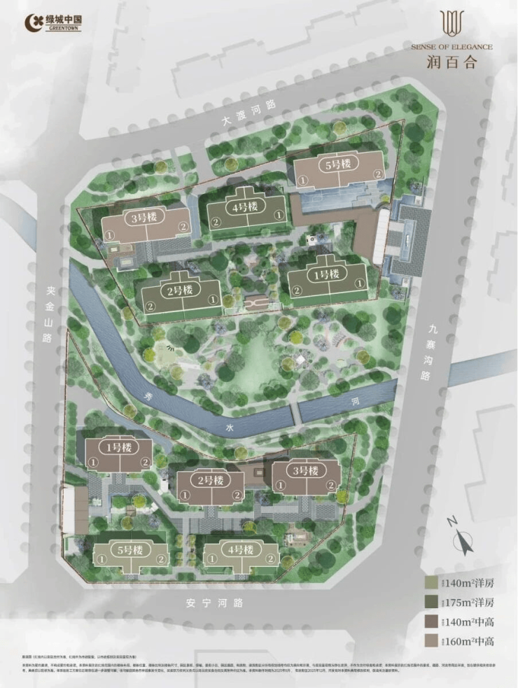 绿城润百合坐落于攀成钢以东区域,其具备“公园 + 滨水 + 低容积率”的稀缺特质。从整体营造方面来看,该项目围绕着家楼下的公园展开规划,巧妙地将流水隐匿于草坪之间,使得生态元素柔和了城市公园与社区的界限。项目总占地面积约 26 亩,被秀水河一分为二,形成南北两个各 13 亩的小地块。在布局上,绿城秉持南北排列式设计,目的在于保障每一栋楼都能拥有充足的采光面与观景面。项目打造了五栋 7F 洋房以及五栋 17F 小高层,全部采用两梯两户的设计,且均为四房户型。