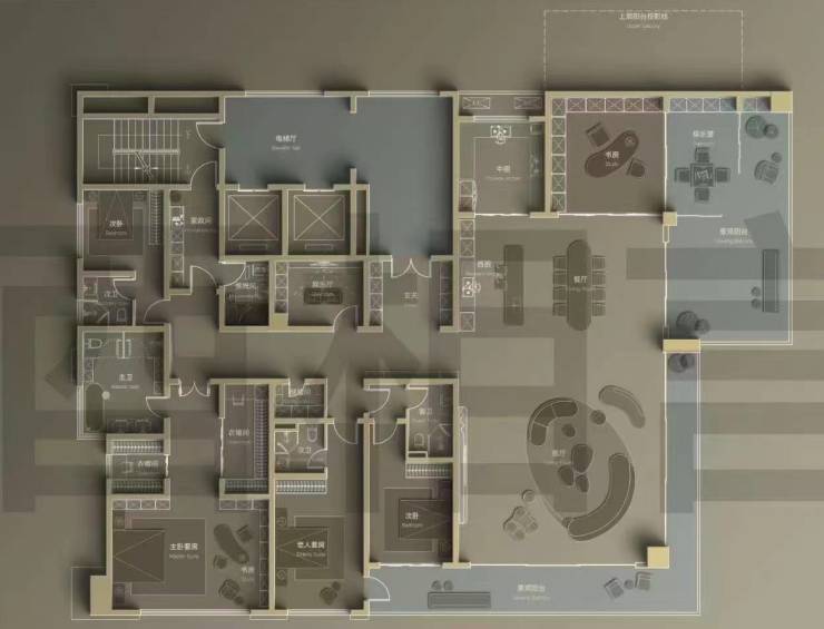 汲取美第奇家族庄园的造园概念,融入江畔立体花园模块,高层营造五大剧场式精致庭院,低密沿南北轴线规划两条林下景观廊道。