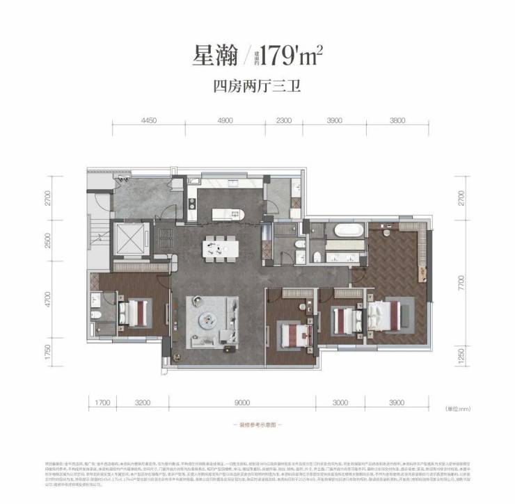 该户型采用LDKB(客餐厨阳台)一体化设计,打造出极具开放感的家庭社交核心区域。双套房的设计十分贴心,既充分保障了主人的私密空间与尊崇地位,又为其他家庭成员提供了独立且舒适的居住空间,无疑是成长型家庭一步到位的理想之选。 建面约179㎡