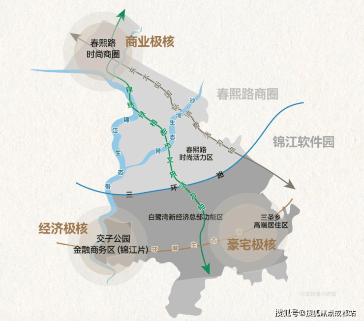 “一核两轴三带三区”锦江规划交融成都“向东向南发展、回归主城态势中国三圣乡驸马半岛,屹立在多重战略交汇点笃定城市发展价值高地