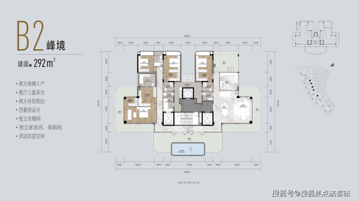 5、最强产品:约35m2U型环幕露台,270°广阔瞰景视野;约3.3-5.8米奢阔层高;3梯2户主人独梯,约2.2米超大电梯进深尺度,成都豪宅NO.1。