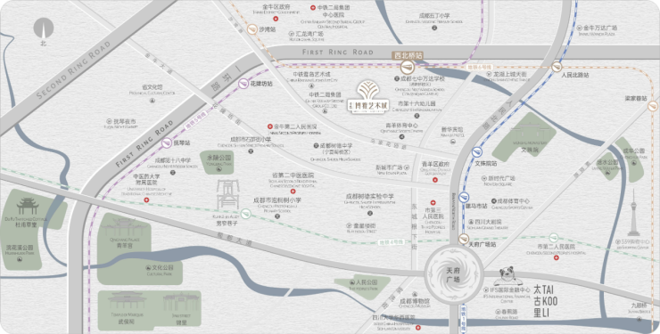 该项目坐落于金牛区与青羊区交界处(属金牛区)的通锦路片区,位置十分优越。项目北侧是前两年备受关注的热门网红盘通锦坊,南侧与青羊区体育中心紧密相邻,实实在在处于一环内的核心地段。在衡量主城价值时,人们通常会从地段和配套等方面进行考量。然而,中铁博雅艺术城带来了全新的价值理念:主城真正的终极竞争力,在于能在土地资源珍贵的区域,为人们提供“富有时间深度的人文体验”。如果说宽窄巷子代表着“世界眼中的成都”,那么中铁博雅艺术城则堪称“成都人的艺术自留地”。它以千年的历史文脉为底蕴,以百年的生活气息为骨架,精心构建出“可居住、可游览、可感知、可传承”的东方艺术境界。