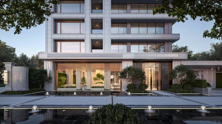 项目汇聚HWCD、矩阵纵横、奥雅等国际大师团队,邀请文化顾问深度赋能,将纽约大都会美学与意大利文艺复兴造园艺术融入建筑与景观。建筑立面以巴西白玫瑰石材干挂到顶,搭配局部铝板与金属格栅,复刻帝国大厦等百年地标的质感,成为麓湖天际线的美学亮点。
