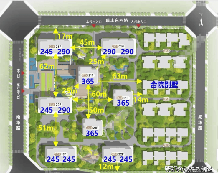 招商玺项目产品建筑形态以高层+叠拼组合形式呈现,西侧规划为8栋21-23层的高层产品,户型面积段分别为245㎡、290㎡、365㎡;东侧规划为6栋独栋合院产品,户型面积段为396㎡、489㎡。