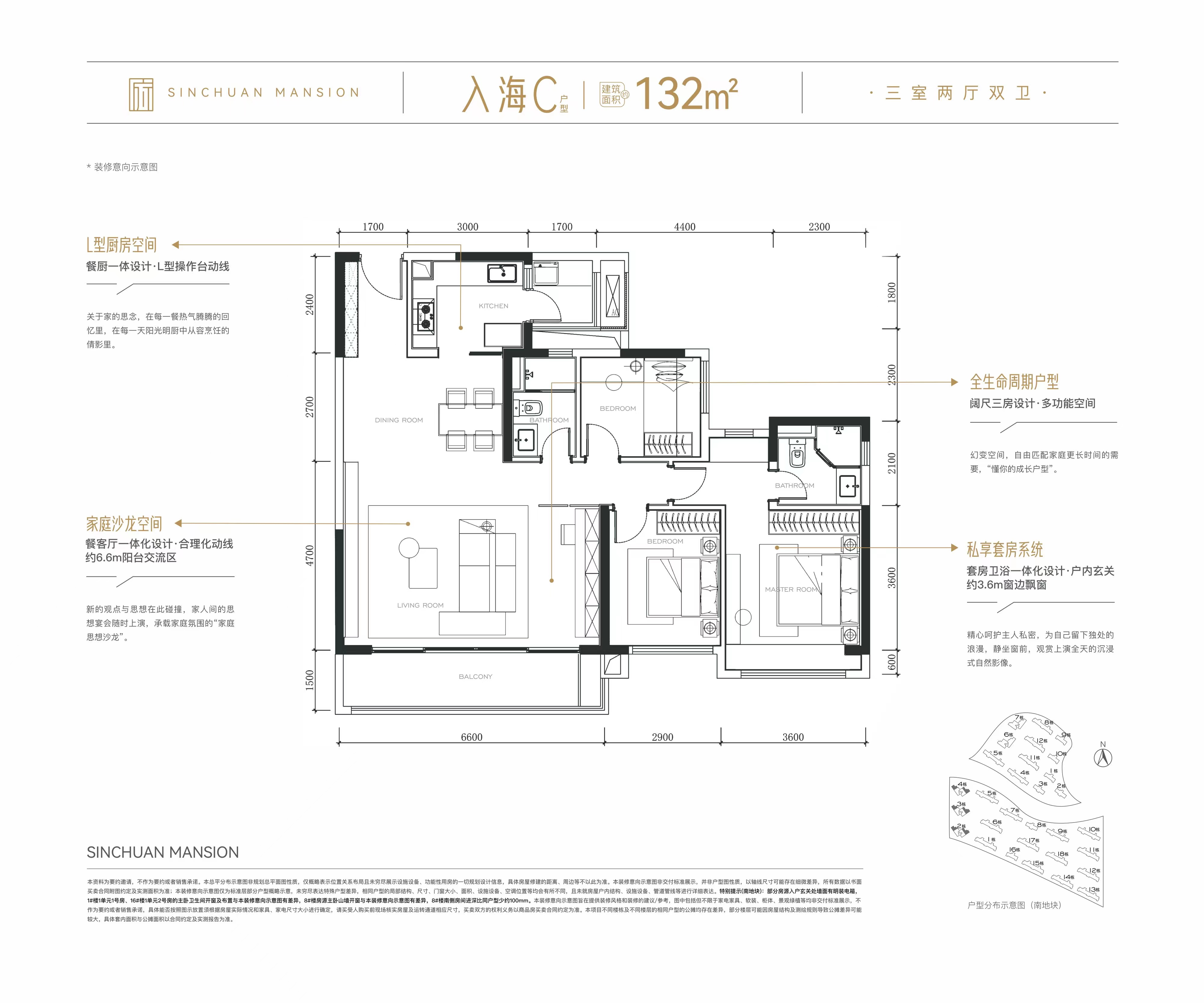 王炸户型 ▣全生命周期户型,建面约132㎡三房双卫,可幻变四房 ▣餐客厅一体化设计,约31㎡大宽厅,动静分区,约6.6米客厅面宽